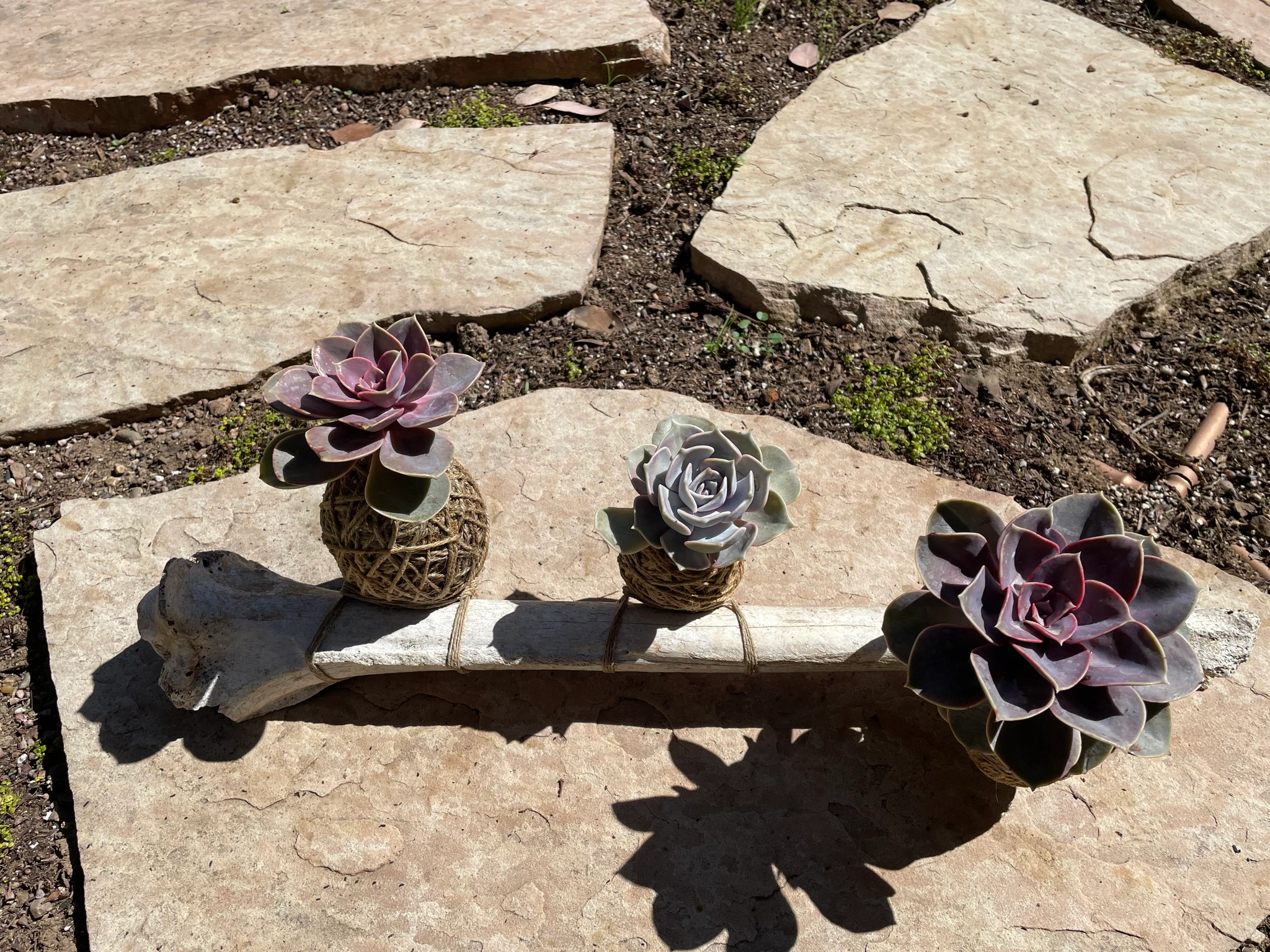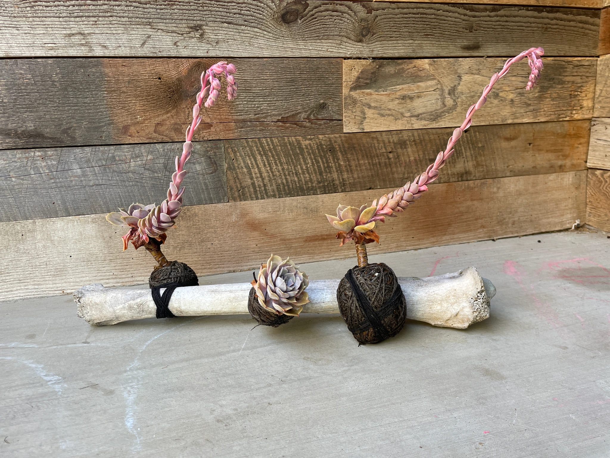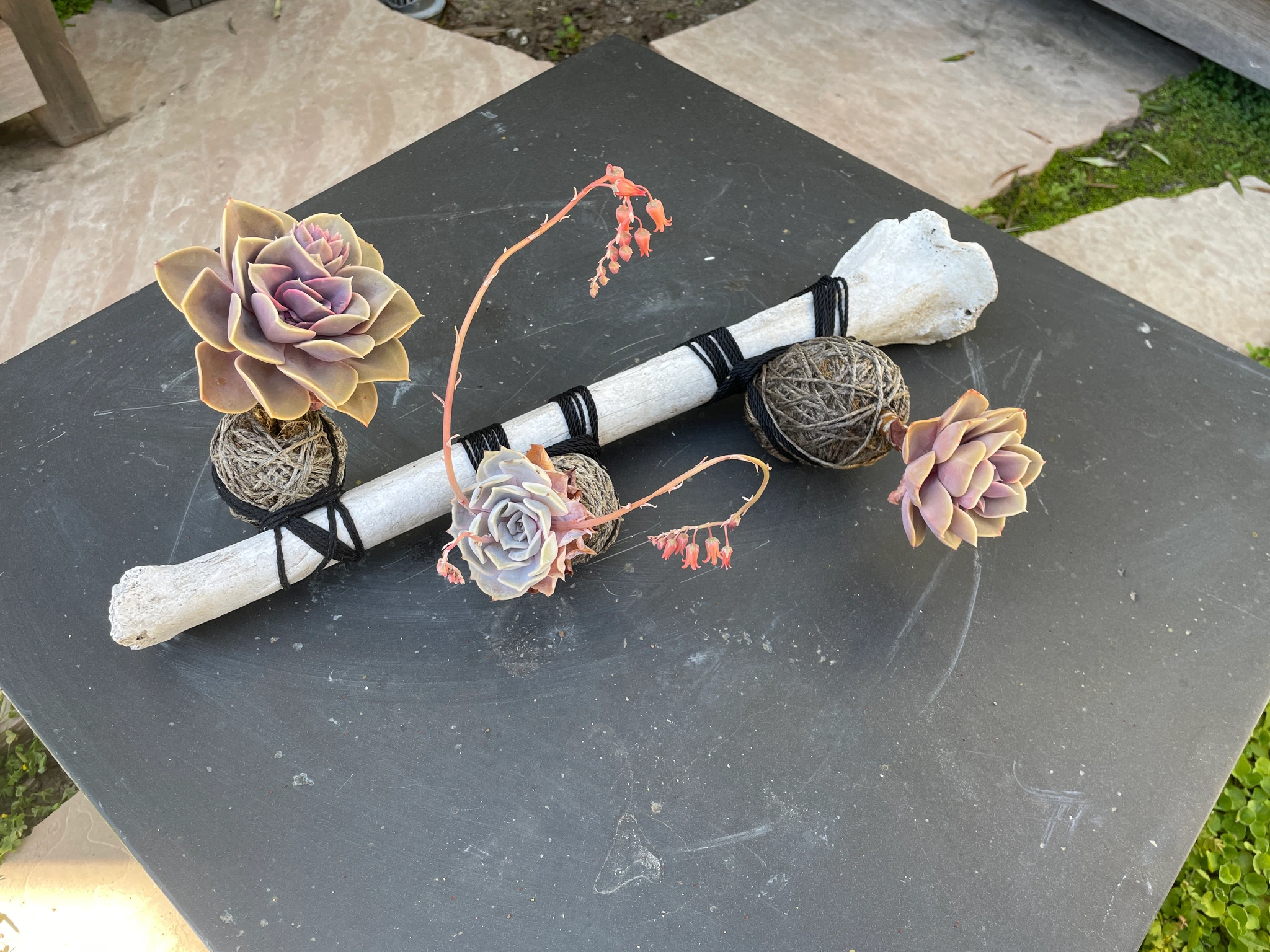 Succulent kokedama mounted to cow bone. Cow bone found slightly buried on a hillside in Three Rivers