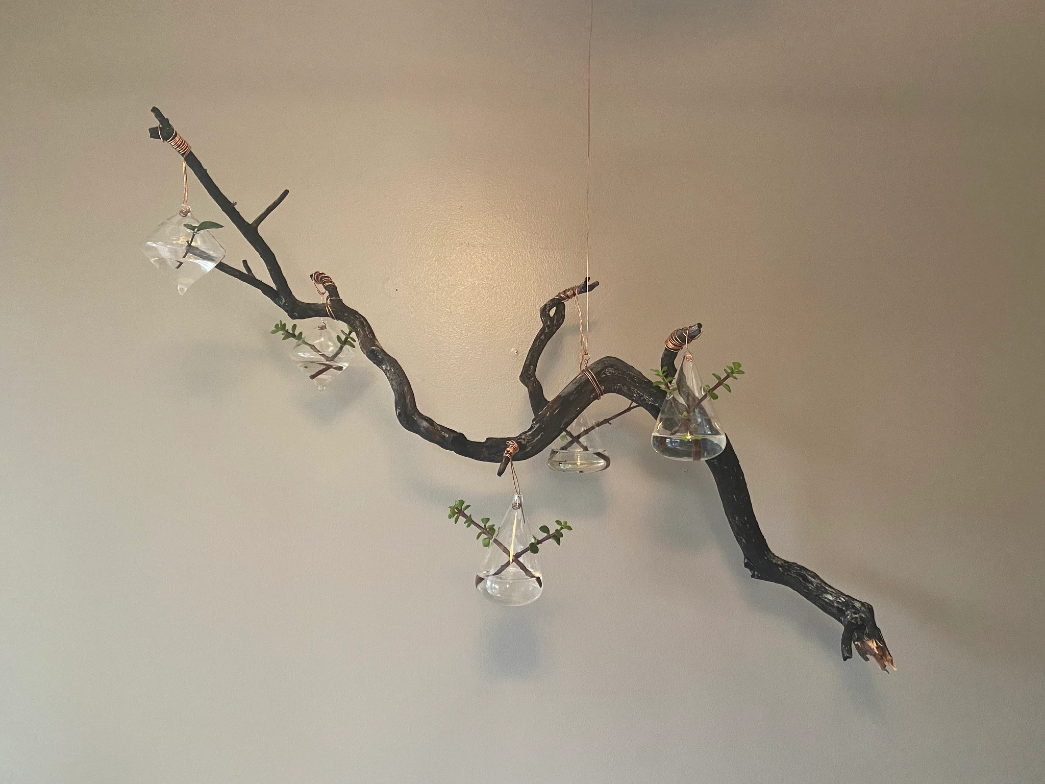 Propagation vessels mounted to wood with copper wire. Wood taken from burn patch in Santa Monica mountains